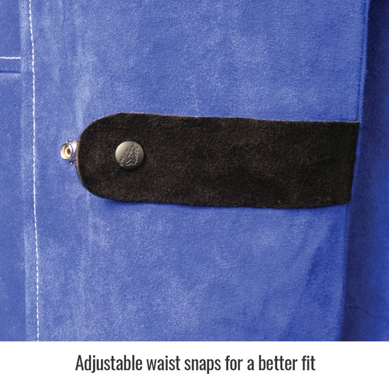The Black Stallion® Color Block leather welding jacket is made from sturdy black and royal blue split cowhide leather. It has a 30 inch length and features stand up welding collar and gusseted underarms. The JL1030-BB comes complete with satin lined shoulders for easy on/off. It has one inside pocket, one scribe pocket and waist adjustment snaps. The split cowhide leather provides maximum protection for medium and heavy duty welding and cutting operations.