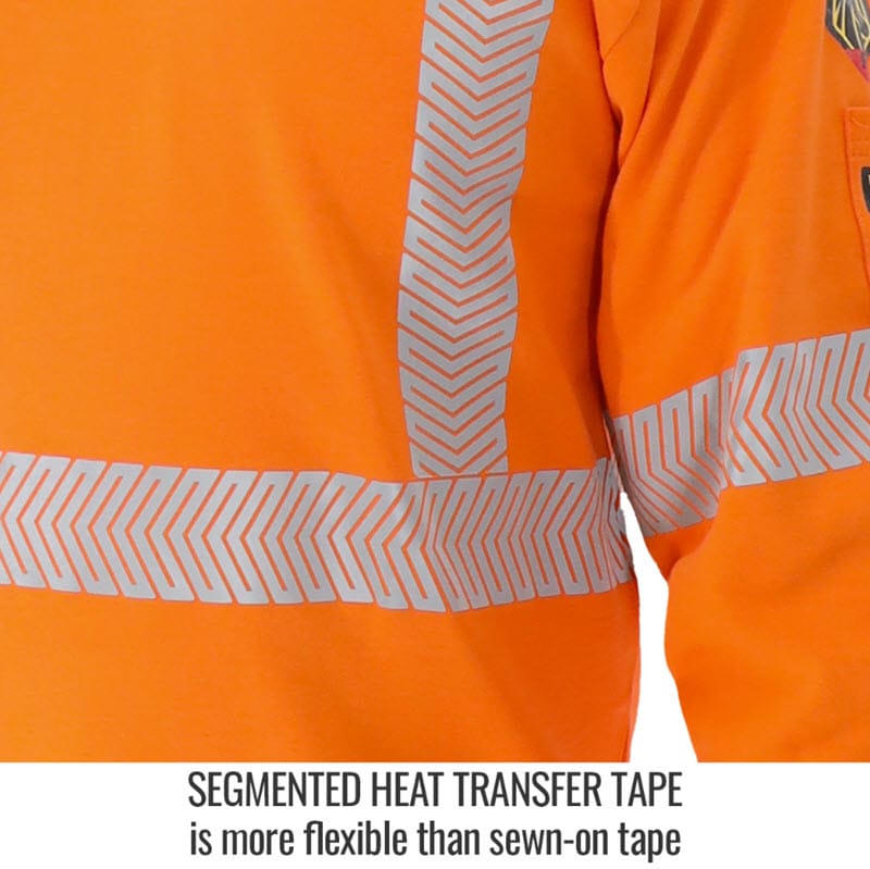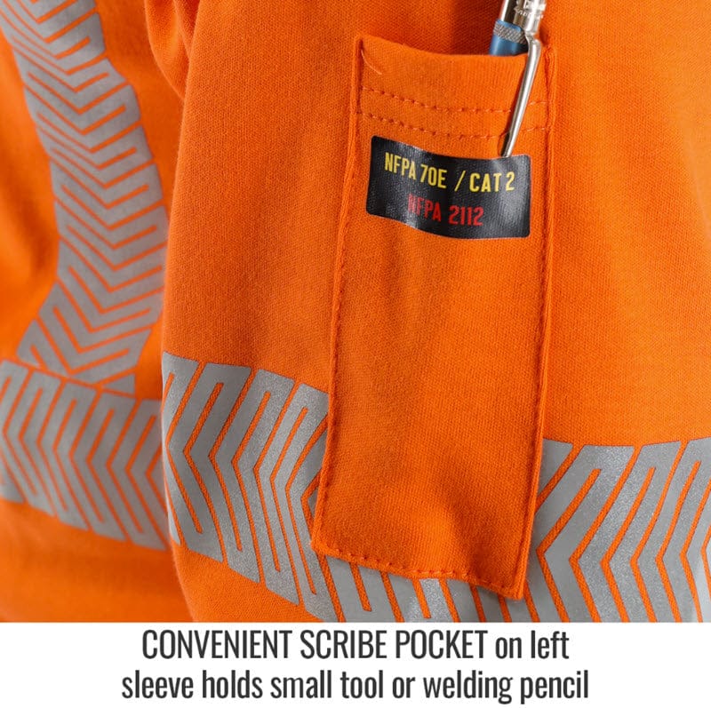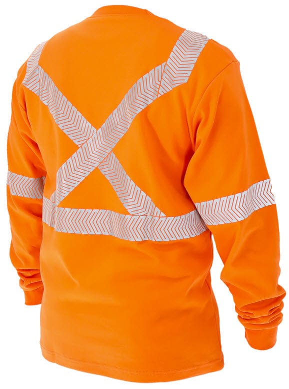The Black Stallion® TF2511 FR orange long sleeve t-shirt is made from 7 ounce flame-resistant cotton and has 2 inch reflective tape throughout to enhance visibility. It provides flash fire and arc flash protection. The heavier 7 ounce cotton is both NFPA 2112 and NFPA70E compliant and retains its flame-resistant properties through 100 home or 50 commercial washings. Comfortable cotton jersey knit is soft and breathable. This shirt is intended to be worn under welding jackets as a secondary source of welding protection.