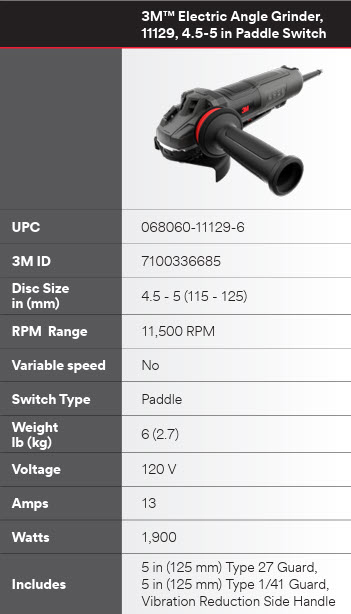 Genuine 3M™ 11129 Electric Angle Grinder with paddle switch accommodates a variety of 4 1/2" to 5" abrasive discs and wheels for your metal grinding and finshing applications. The 11129 features a powerful 13 amp electric motor that delivers 1,9000 watts of power, and provides excellent torque. The paddle switch and low-vibration handle enhance operator comfort.