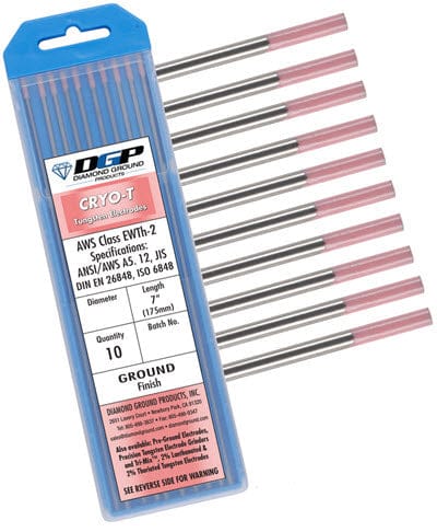 Package of 10 - The Diamond Ground CRYO-T 7 inch 2% thoriated tungsten electrode, size .040, is cryogenically treated to provide longer life and easier arc starts when compared to standard thoriated tungsten. The extremely cold temperatures of the cryogenic process produce a tungsten blend that is more dense and therefore, more durable. Cryo-T tungsten can be used in the same welding applications as standard 2% thoriated tungsten. It is ideal for DC TIG welding of steel and stainless steel. Each tungsten electrode has a mechanically ground finish for consistent purity and performance.
