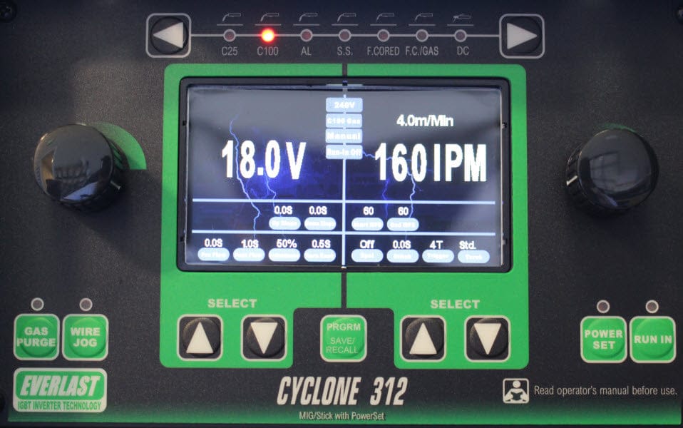 The Everlast CYCLONE 312i is a 300 amp industrial MIG welder that is also capable of stick welding. The CYCLONE 312i operates on single-phase, 240 volt input power and comes complete with everything you need to MIG weld or stick weld - except the shielding gas and filler metals. The CYCLONES's PowerSet feature removes the guesswork in setting the right welding parameters for your job. A large color display guides you through your specific welding application to ensure a great weld every time. There are also no hidden menus. Simply select your welding process, and all process-specific settings are displayed on a single screen.