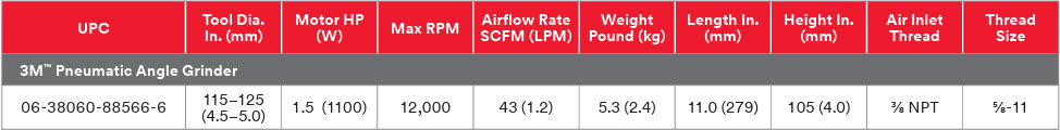 The 3M 88566 pneumatic angle grinder operates at a maximum speed of 12,000 RPM. It has a 5/8-11" thread and a 3/8" NPT air inlet.