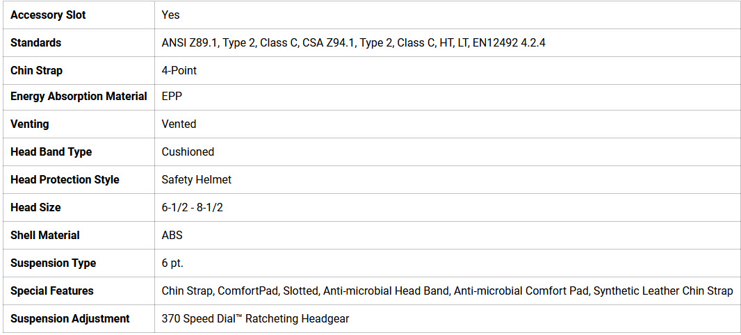 The XS2-500 safety helmet is fully compatible with the Jackson Safety® Hard Hat Interchange System™. Accessory slots allow a variety of OPTIONAL Jackson Safety accessories to be mounted to your safety helmet, including: welding helmets, face shields, ear muffs and headlamps. The XS2-500 is excellent for a variety of construction, oil & gas, industrial and forestry applications, where head protection is required. This vented safety helmet is rated ANSI Type 2, HT-LT, Class C (conductive).