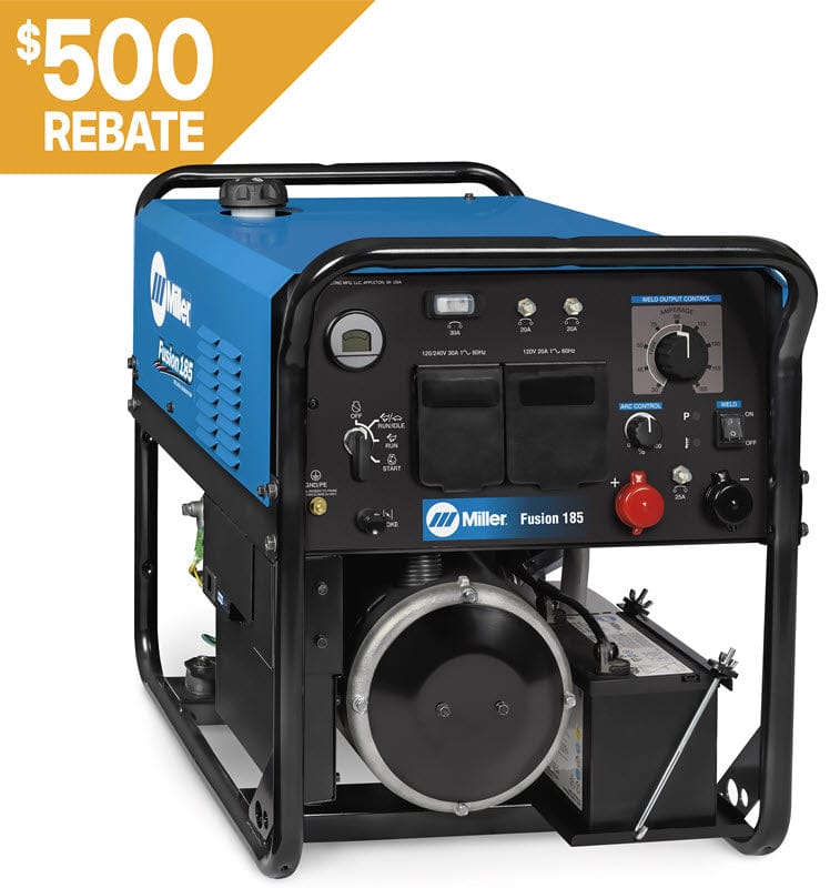 Miller® Fusion 185 with electric start is a 185 amp DC stick welder/generator that operates as either an engine driven welder or plug-in electric welder.