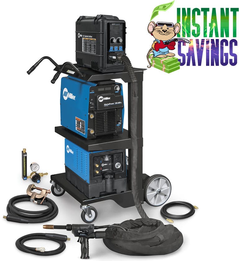 The Miller® AlumaFeed™ 350 MIGRunner™ w/XR™-Pistol 25 ft. Water-Cooled Push-Pull Gun is a complete 425 amp MIG welding package that is specifically designed for pulsed MIG welding of aluminum. The XR-AlumaFeed™ Suitcase® wire feeder and AlumaPower™ 350 MPa produces aluminum MIG welds that rival the quality and appearance of TIG welds. Built-in MIG and pulsed MIG welding programs allow for easy set up of weld parameters for a variety of welding wires. (Built-in Pulsed MIG programs are available for aluminum MIG wire ONLY). Coolmate™ 3 water cooler included in MIGRunner package.