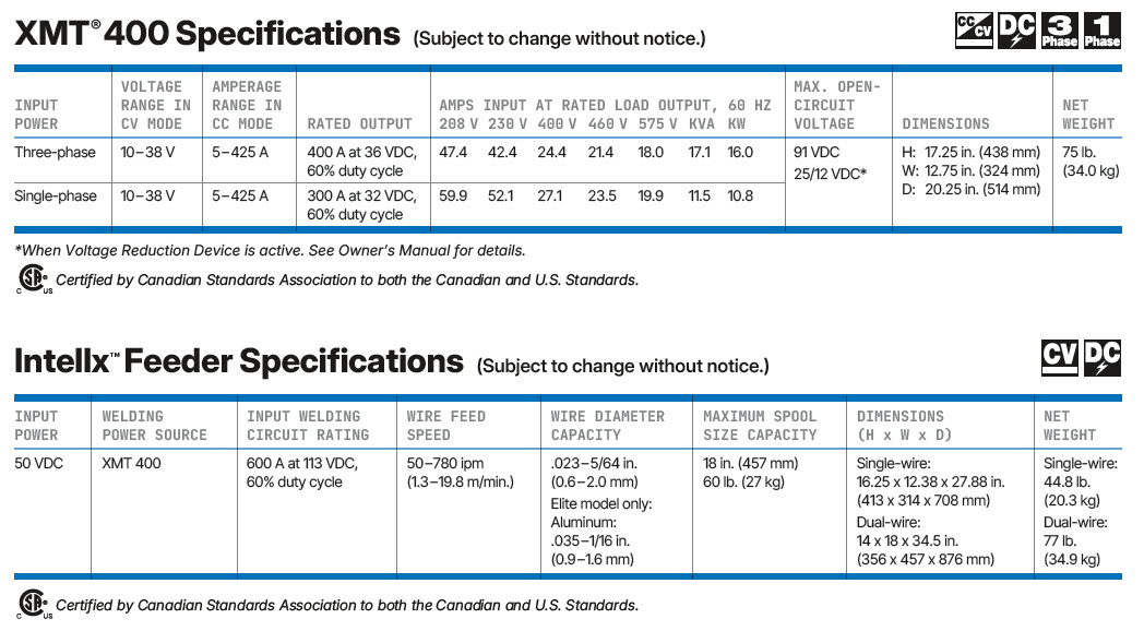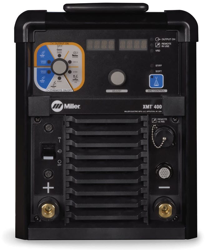 The Miller® XMT® 400 MIGRunner™ with Intellx™ Pro Wire Feeder is a complete 400 amp MIG and pulsed-MIG welding system. The XMT 400 amp multi-process welder is capable of MIG, Stick and DC TIG welding. It operates on both three-phase and single-phase input power and features Miller's Auto-Line,™ which means you can use 208 volt to 575 volt, single or three-phase input power without manual linking. The included Intellx Pro wire feeder comes complete with digital meters, plus advanced features like EZ-Set MIG, EZ-Set Accu-Pulse™, pre-programmed parameters for steel MIG welding plus two open memory slots to store your custom welding procedures. Dual-wire model allows two different wire types to be available on one feeder, avoiding downtime from changing spools and drive rolls.