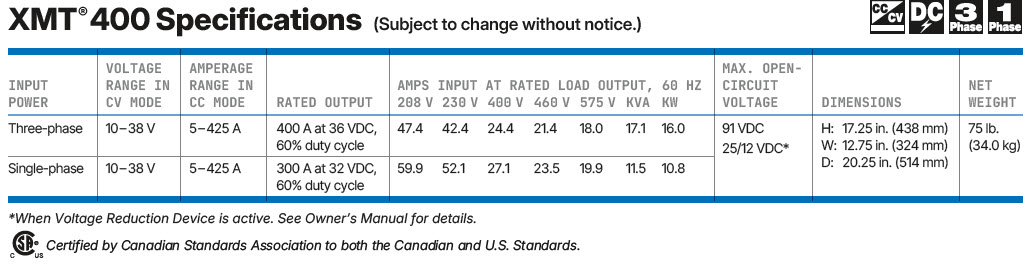 The XMT 400 is easy to move around the shop or jobsite. Its rugged case design ensures it will stand up to the punishment of extreme work environments. The XMT 400 can carbon arc gouge with carbons up to 5/16" diameter. When paired with a wire feeder or spool gun, it makes an excellent MIG and Flux-Cored welder. It also features built-in Lift-Arc™ TIG arc starting for smooth DC TIG arc starts without the use of high frequency.