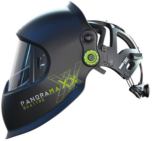 The Optrel® Panoramaxx Quattro auto-darkening welding hood, with perfect 1/1/1/1 optical clarity rating, provides up to 6X the viewing area of a standard 2" X 4" auto-dark welding lens. The key to this revolutionary technology is the size and shape of the ADF, coupled with the unique Panoramaxx shell design, which allows the welding lens to be positioned closer to your face. The Panoramaxx also has advanced features like SHADETRONIC®, which automatically adjusts the shade level based on the brightness of the arc and True Color, which allows for realistic color perception in light or dark states.
