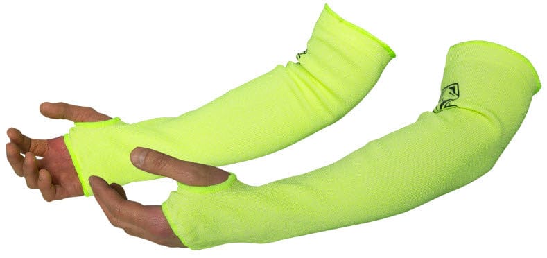 One Pair - Black Stallion® cut resistant Hi-Vis Lime HPPE knit 18 inch sleeves with thumb hole provide ANSI Cut Level 4 protection. High performance polyethylene knit is difficult to cut or fray and contains stainless steel, fiberglass and other composite filaments to provide medium protection against cut hazards. One inch elastic bands with silicon grips help hold sleeves securely in place.