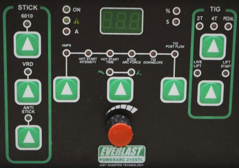 The Everlast PowerArc 210STL Stick/TIG Welder is a 200 amp DC Stick welder that is also capable of DC TIG welding. Requires just a simple touch of the button to select 6010/Cellulosic mode. With adjustable hot start and arc force, the user can completely control the intensity of these features and tailor it to meet their welding style and work environment. The welder also features a lift start TIG that is controlled by an optional foot pedal or standard torch switch and a live lift start. Allows greater flexibility where using a foot pedal or torch switch isn't feasible or practical or where table work suits some form of amperage control. For added TIG capability, downslope and post flow control have been added along with 2T and 4T torch switch operation options. The PowerARC 210STL greatly exceeds the capability of other basic "200" and "210" stick and stick/TIG units on the market when you compare features, price and performance. The PowerArc 210STL has an industry best five year factory warranty.