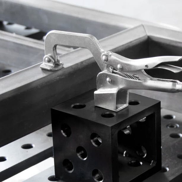 Genuine BuildPro® Inserta Pliers insert into 5/8" holes for fast hold-down clamping. Patented rear crank handle permits clamp pressure adjustment while clamp is in locked position. Pre-set the clamp opening in repetitive clamping applications. Can be mounted on the Right Angle Bracket, Riser Block, or Clamping Squares for push down clamping at an elevated height in taller workpieces.