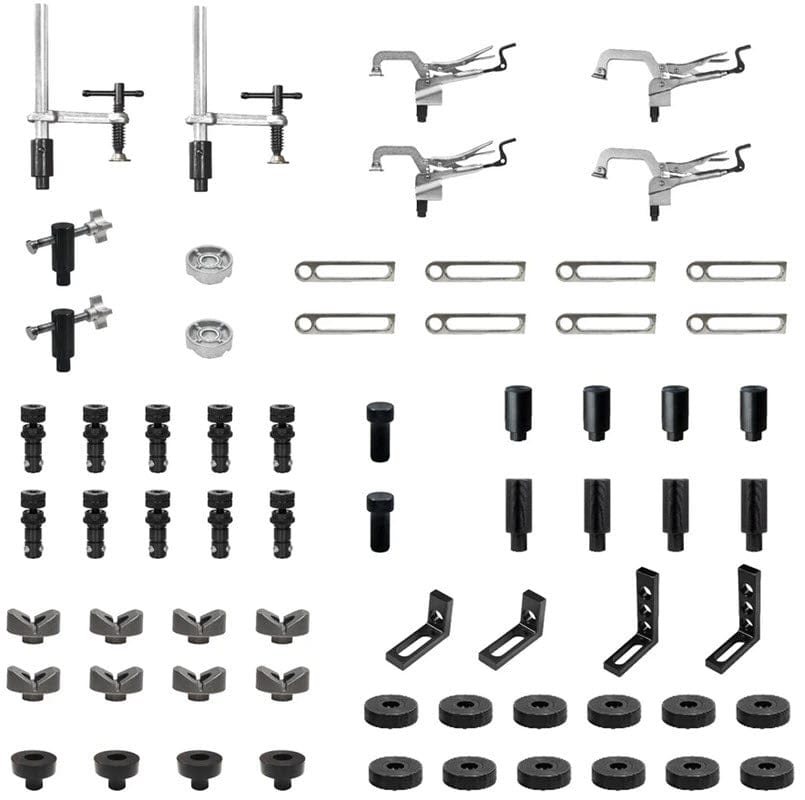 Genuine BuildPro® Rhino Cart® F3 Fixturing Package TD5-4830Q-K3 includes a 48 X 30 inch Rhino Cart F3 Mobile Working Station and 66 piece fixturing kit. The F3 features enhanced tool mounting options and two slag trays. The frame legs now come with 7mm holes, for mounting tools, shelves and other custom fixtures. Two slag tray run the length of the underside of the table, for easy slag and dust removal.