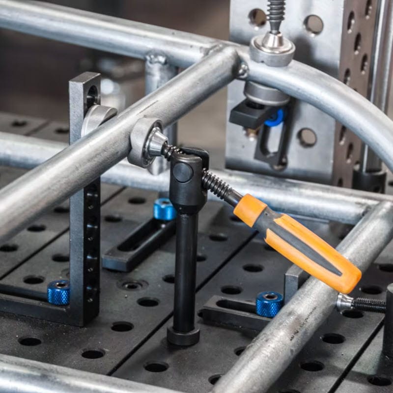 Genuine BuildPro® Pivoting Straight Handle T-Post Clamp fits the 5/8" holes on any 5/8 BuildPro tabletop for quick, easy clamping. The Pivoting T-Post Clamp can be used for vertical, horizontal and angled clamping. It features an adjustable stop ring that allows for variable clamp height. A magnetic top V-Pad (T54217) is INCLUDED for clamping square and bar stock. The T51670 has a max 5 inch clamping capacity and a variable 1.75 to 5 inch throat depth.