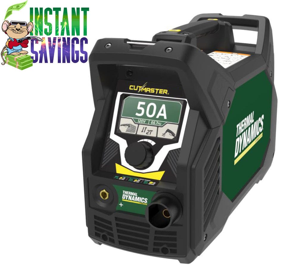 Thermal Dynamics® Cutmaster® 50+ is a 50 amp plasma cutter that cuts up to 5/8 inch thick mild steel and operates on single-phase, 110V to 240V input power.