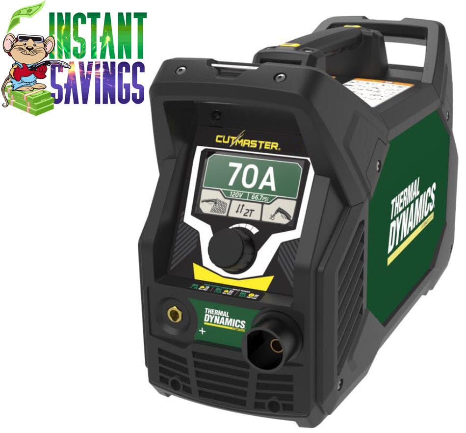 Thermal Dynamics® Cutmaster® 70+ is a 70 amp plasma cutter that cuts up to 3/4 inch thick mild steel and operates on single-phase, 110V to 240V input power.