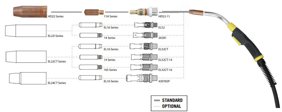 Genuine Tweco® Elite™ 250 3545 next-generation MIG gun is a premier 250 amp MIG welding torch that features a Miller® back end and trigger connection. The Elite 250 comes complete with standard Tweco HD series consumables. It can also be converted to Tweco standard duty, Eliminator™ or Velocity2™ consumables, by simply changing the gas diffuser.
