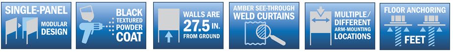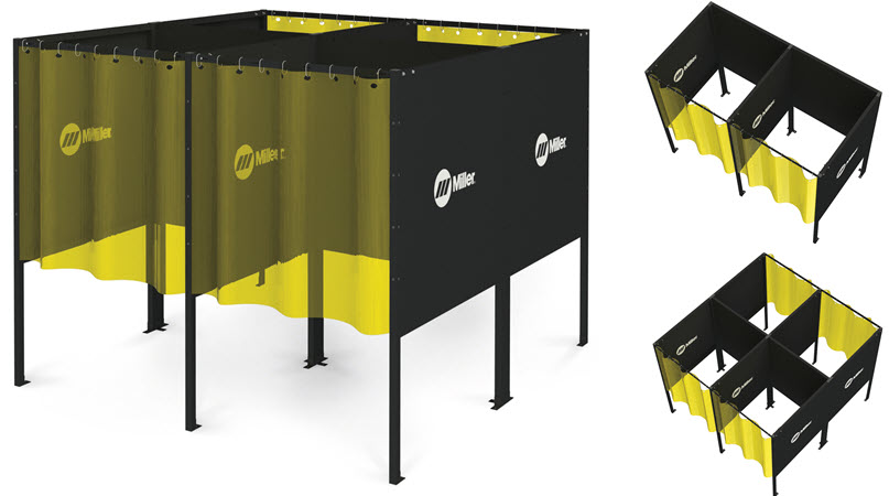The Miller Weld Booth's solid panels are finished with a textured powder coat, for long life and durability. Each panel stands 27.5 inches off the floor and can accommodate the mounting of an OPTIONAL fume extraction arm. Overall Weld Booth height is 78 inches. Multiple weld booths can be assembled together to form a customized modular welding station area. The yellow welding curtain protects passersby from harmful arc flash and UV rays. The curtain itself is approved by the California fire marshal.![]()