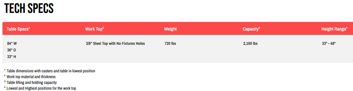 Genuine Inventive® Products Powerlift™ Workman Series™ 84" X 36" Welding Table is a powered, adjustable height heavy duty welding table, with a solid steel top. The Powerlift Workman has a working tabletop height of between 33 inches and 48 inches. With four memory settings, plus manual height control, you can precisely dial in the exact work height your welding application requires. The Powerlift Workman has a static and lifting weight capacity of 2,100 pounds.