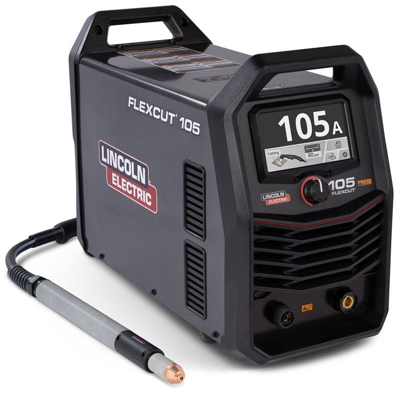 The FlexCut 105 comes complete with a color LCD user interface that helps get you cutting in seconds. The FlexCut's continuous output cuts through gaps and even expanded metal quickly and easily. The electrode and nozzle design allow for more efficient cooling airflow, meaning longer consumable life - saving you money. The Lincoln FlexCut 105 plasma cutter weighs under 91 lbs. Hook up to compressed air and get cutting right away.