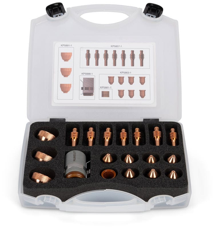 Genuine Lincoln® FlexCut® 45 amp mechanized cutting plasma consumable kit for your FlexCut PRO FlexConnect™ mechanized plasma torch. The KP5830-45 contains the most common wear parts and consumables for mechanized cutting at 45 amp output with your Lincoln FlexCut plasma cutter. The kit comes with a sturdy plastic storage case, with individually listed parts and part numbers, for easy reference.