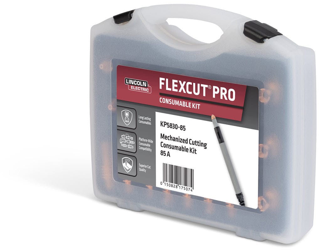 Genuine Lincoln® FlexCut® 85 amp mechanized cutting plasma consumable kit for your FlexCut PRO FlexConnect™ mechanized plasma torch. The KP5830-85 contains the most common wear parts and consumables for mechanized cutting at 85 amp output with your Lincoln FlexCut plasma cutter. The kit comes with a sturdy plastic storage case, with individually listed parts and part numbers, for easy reference.