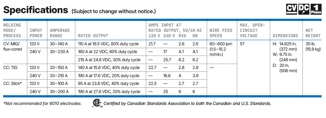Combines best-in-class arc characteristics with the portability of a 35-pound machine. The arc is extremely forgiving to variations in arc length and travel speeds