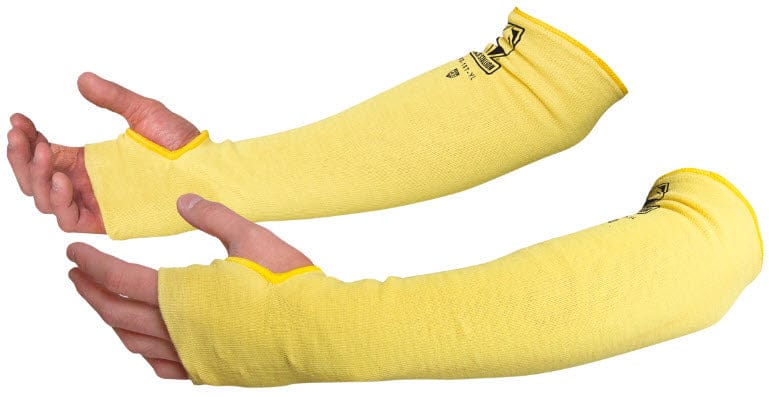 One Pair - Black Stallion® cut resistant yellow DuPont™ Kevlar® knit 18 inch FR sleeves with thumb hole provide cut, abrasion and heat protection. Kevlar® knit is inherently flame-resistant and maintains its FR properties for the life of the garment. Sleeves are rated ANSI Cut Level 3 for added safety.