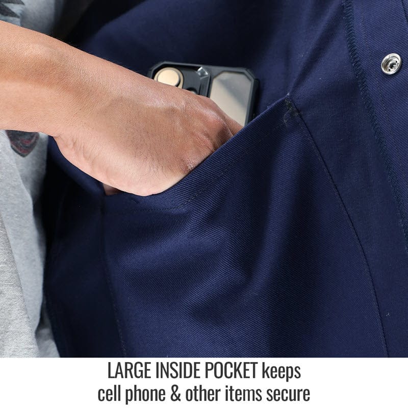 Genuine Black Stallion® JH3025-NY Hybrid Welding Jacket is both arc flash (AR) and flame resistant (FR) and is made from 7 ounce Para-Aramid sleeves, 9 ounce navy FR cotton front and 7 ounce FR cotton knit back. The para aramid sleeves are ANSI rated 1 for heat resistance and A4 for cut resistance. They have cut resistant cuffs with thumb hole, for a variety of industrial applications.