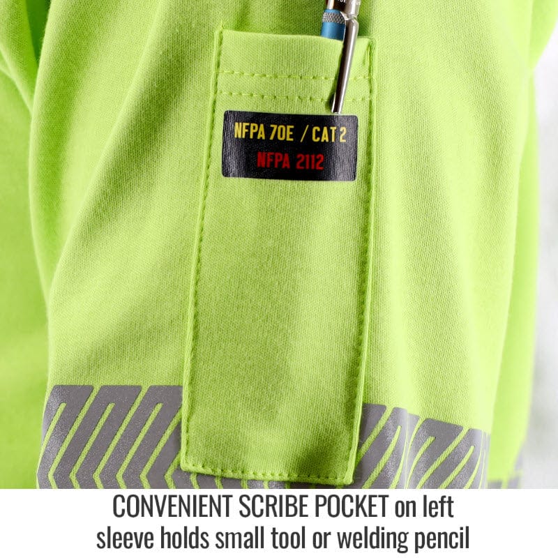The Black Stallion® TF2511 FR Lime Green long sleeve t-shirt is made from 7 ounce flame-resistant cotton and has 2 inch reflective tape throughout to enhance visibility. It provides flash fire and arc flash protection. The heavier 7 ounce cotton is both NFPA 2112 and NFPA70E compliant and retains its flame-resistant properties through 100 home or 50 commercial washings. Comfortable cotton jersey knit is soft and breathable. This shirt is intended to be worn under welding jackets as a secondary source of welding protection.