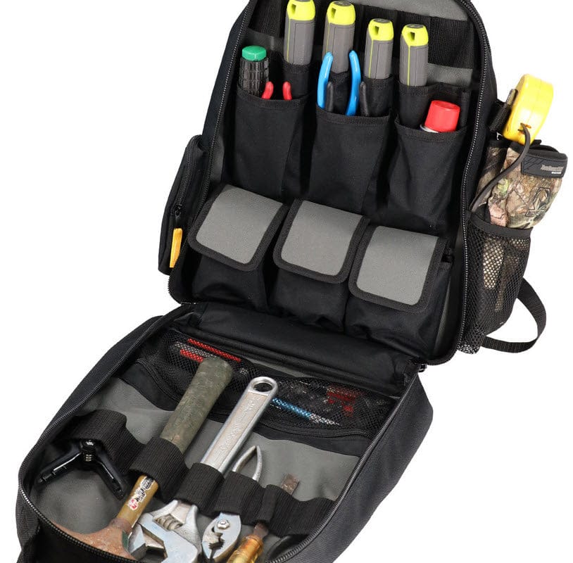 Genuine Black Stallion® GB400 Pro Tool Backpack is a heavy duty, 1200D PVC-coated polyester backpack that is specifically designed for tool transportation and storage. The GB400 safely and securely stores your tools, hard hat and even your laptop computer. It can be worn over the shoulders as a rugged backpack, or it can also be carried by its sturdy, reinforced top handle.