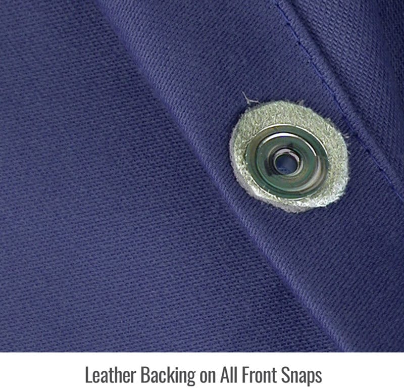 The Black Stallion® JF1625-NG Stretch-Back Welding Jacket combines 9 ounce navy blue FR cotton front with 7 ounce gray FR stretch cotton back to maximize coolness and comfort. Stretch cotton back moves with you while allowing greater air flow through the garment. The JF1625-NG is designed for light duty TIG and MIG welding, is 32 inches long and features inside pocket, scribe pocket and adjustable snap wrists. This welding jacket will hold its flame resistant properties for up to 50 home washings or 25 commercial washings.