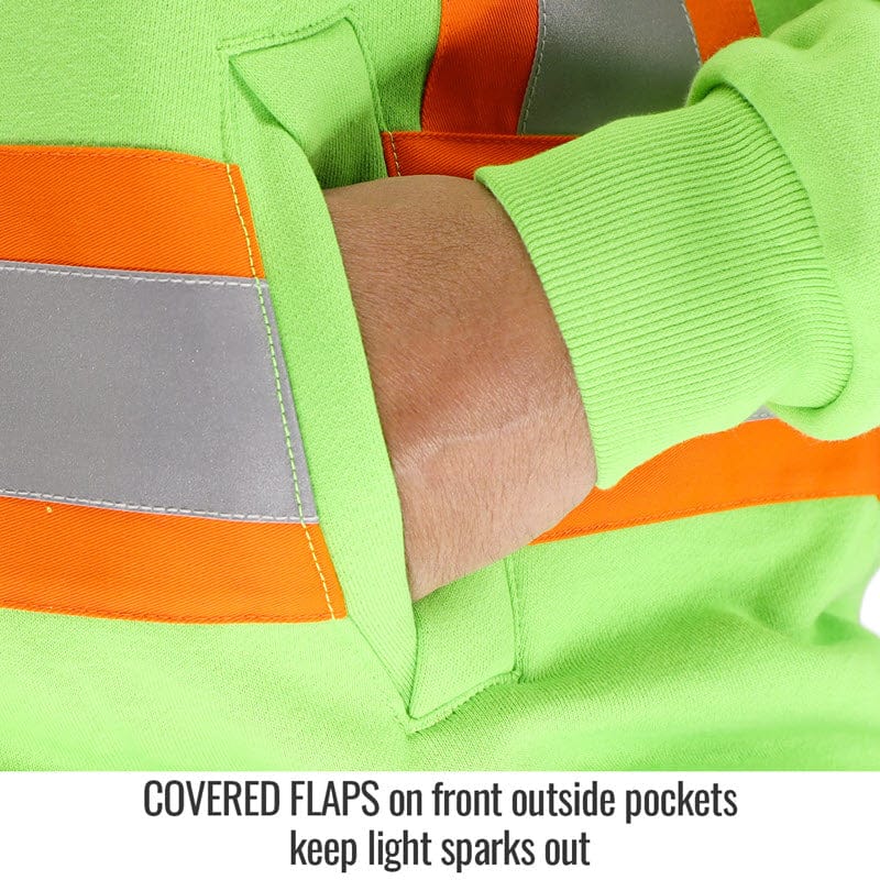 AR/FR standards certifications are clearly visible on the sweatshirt's left sleeve patches. The Black Stallion Hi-Vis lime hooded sweatshirt is NFPA 70E compliant and retains its flame resistant properties for 100 home washings. It has a Category 3 PPE arc flash protection rating. It is excellent for adding warmth and protection for cold weather welding projects and electrical work.