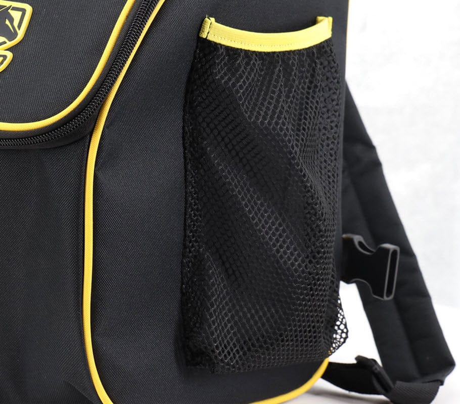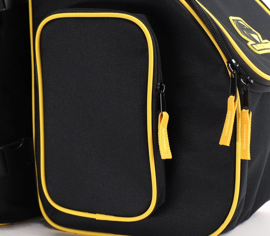 In addition to the large welding helmet compartment, there are two side pockets. The left side pocket has a zipper closure for safety glasses or tools. The right side mesh pocket is ideal for storing welding gloves.