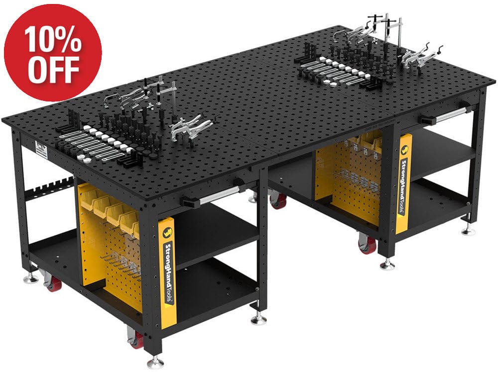 The Rhino Bridge Package is ideal for shops that fabricate, weld, or repair a variety of different-sized projects. The heat treated tabletops and connecting plate are resistant to wear, weld spatter and rust. They are also reversible. Simply flip the tabletop, or connecting plate, for a new work surface. The CNC hole 2 x 2 spacing pattern allows for accurate and repeatable setups. All clamps and fixturing elements are designed to be placed and easily adjusted at the top of the table. Steel table legs include casters and leveling legs for mobile or stationary use, inside or outside the shop. Shelves, racks, and pegboard panel provide lots of convenient storage to keep all your tools within reach while working.