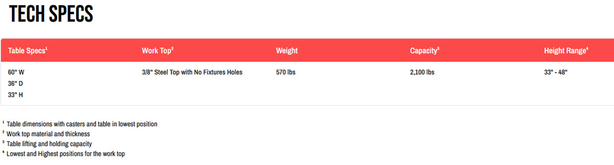 Genuine Inventive® Products Powerlift™ Workman Series™ 60" X 36" Welding Table is a powered, adjustable height heavy duty welding table, with a solid steel top. The Powerlift Workman has a working tabletop height of between 33 inches and 48 inches. With four memory settings, plus manual height control, you can precisely dial in the exact work height your welding application requires. The Powerlift Workman has a static and lifting weight capacity of 2,100 pounds.