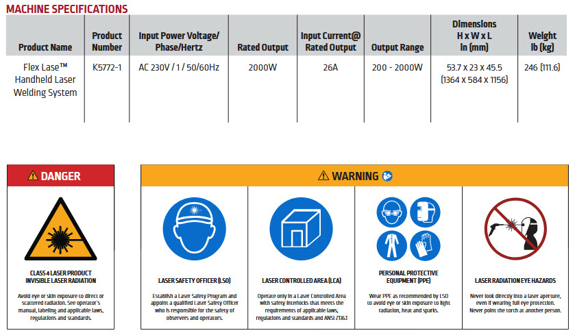 The Lincoln Flex Lase system comes complete with laser welder with handheld laser gun, wire feeder, .035-.045 drive rolls, .045 MIG contact tips, ten spare protective lenses, interconnecting cables, safety glasses and passive laser-rated welding helmet. The Flex Lase 20 power source has a two-year factory warranty. The Flex Feed 25L wire feeder comes with a five-year factory warranty.