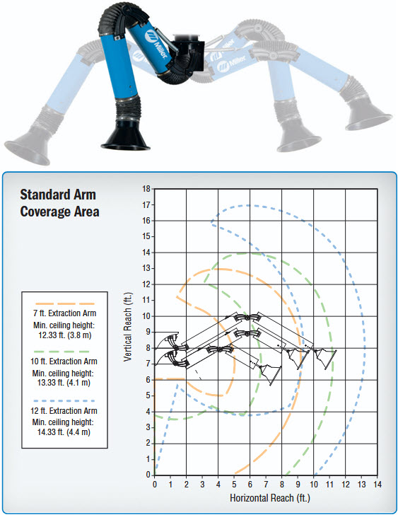 Genuine Miller® FILTAIR® 6-Inch Diameter Standard Fume Extraction Arm is available in 7 ft., 10 ft. or 12 ft. lengths, and is a critical part of your shop's overall weld fume removal solution. It comes preassembled and is designed to be mounted to a wall, pedestal, column or welding fume extractor. External controls and adjustments allow for greater air flow through the arm itself, with no internal components to restrict circulation. FILTAIR® Standard Extraction Arms are compatible with Miller FILTAIR SWX fume extractors, centralized shop systems or competitive equipment.