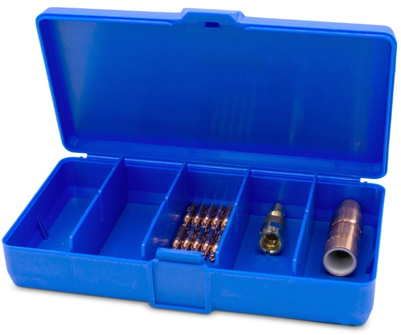 Genuine Miller® Acculock™ MDX™ .023 Consumables Kit for your Miller MDX™-100 MIG gun. Kit comes complete with (1) NS-M1200C nozzle, (1) D-M100 diffuser, (10) T-M023 .023 contact tips and blue storage box.