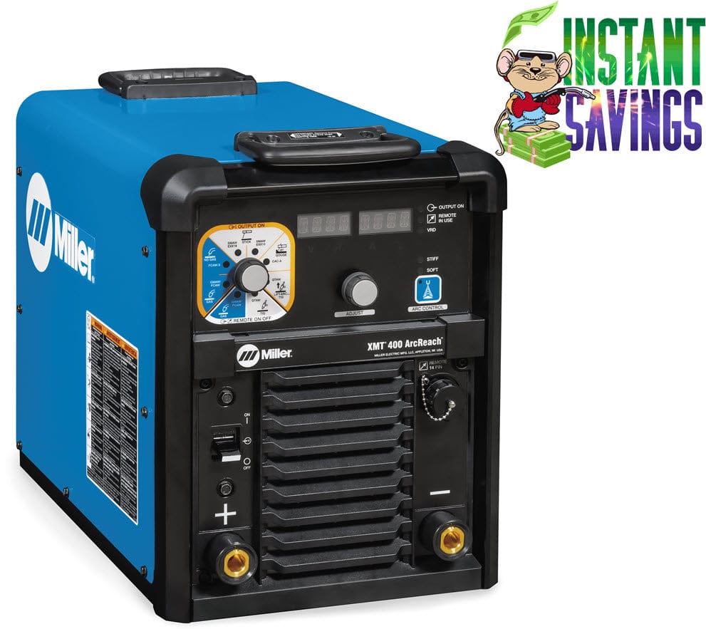 The Miller® XMT® 400 ArcReach® (Tweco®) is a portable 400 amp multi-process welder that weighs just 75 pounds. This welder communicates with a remote Miller® ArcReach® wire feeder or Stick/TIG remote without the use of a remote control cable. The secret to this technology is built-in circuitry in both the XMT 400 ArcReach welder and OPTIONAL ArcReach wire feeder/remote that passes remote signals through the welding leads, eliminating the need for costly remote control cables. ArcReach remote control distance is limited only by the length of your welding cable leads. ArcReach allows your welding operation to take place further away from the welding power source, and reduces downtime and costs by giving the operator full remote control capabilities at the site of the weld. The XMT 400 ArcReach MUST be paired with a Miller ArcReach feeder/remote to get the full benefits of this feature.