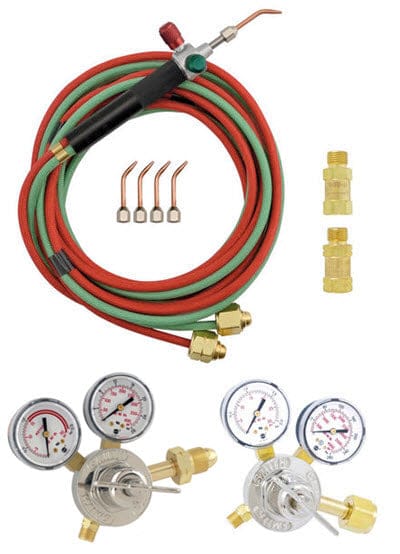 Genuine Little Torch™ 23-1003P jeweler's torch outfit is designed to operate with any propane cylinder equipped with a CGA-510 valve and any industrial oxygen cylinder equipped with a CGA-540 valve. It welds an unlimited range of materials, brazes and solders the tiniest elements with ease, yet produces enough heat to weld steel up to 1/8" thick or melt 3 oz. of silver (using acetylene or hydrogen fuel gas).